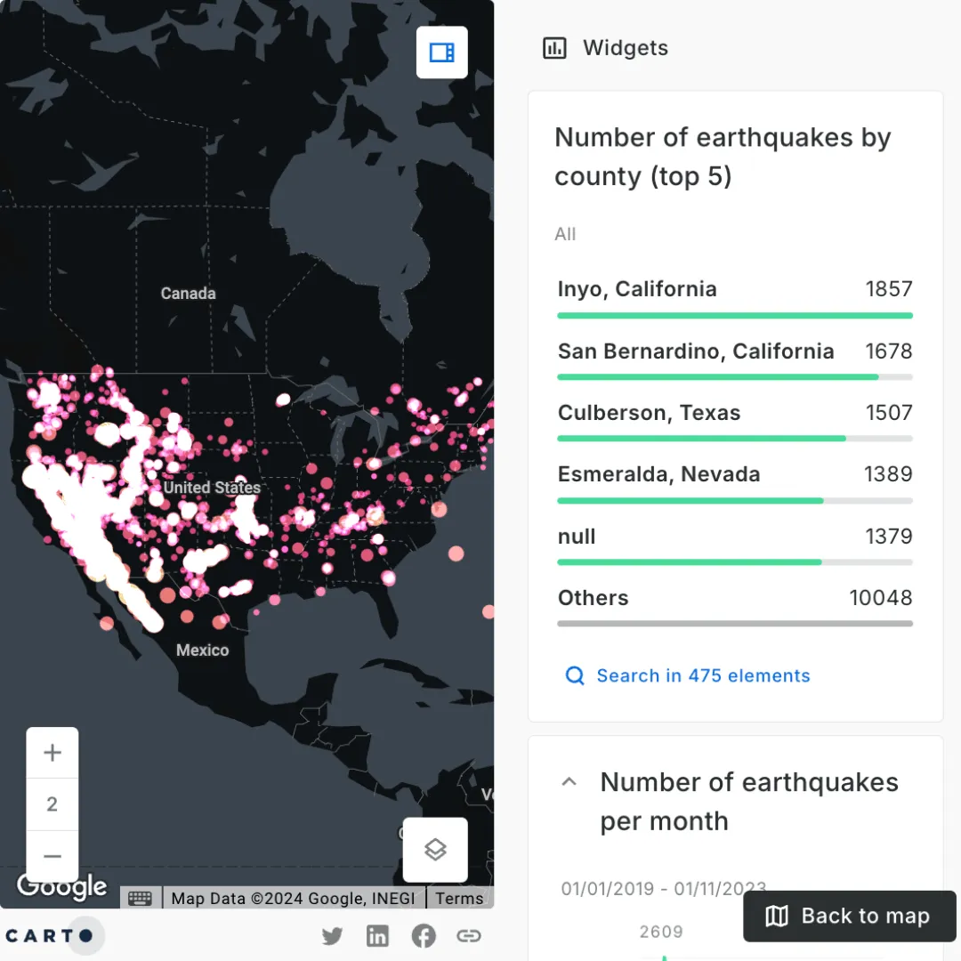Catastrophe analysts can utilize visualizations like this to dynamically explore and analyze the spatial distribution of earthquakes. This tool empowers analysts to identify high-risk zones, assess the frequency and intensity of seismic activity, and make informed decisions that are crucial for developing comprehensive strategies to mitigate the financial impact of earthquakes on insured portfolios.