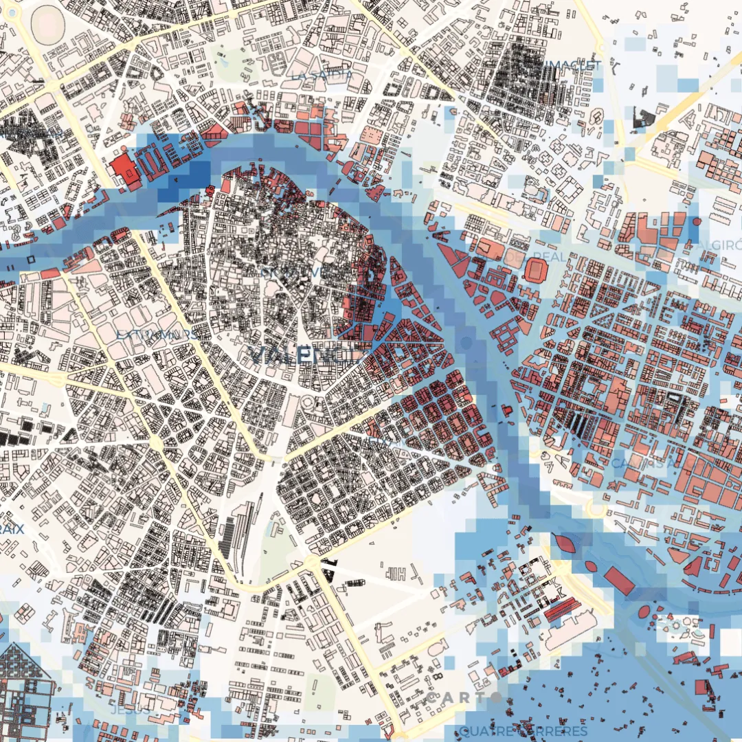 Data used: In this analysis we have mapped building footprints using OSM data. In addition, we have integrated modeled flood depth levels for both river and flash flooding at different return periods provided by our data partner Fathom, a global leader in flood and climate risk analysis and modeling.
