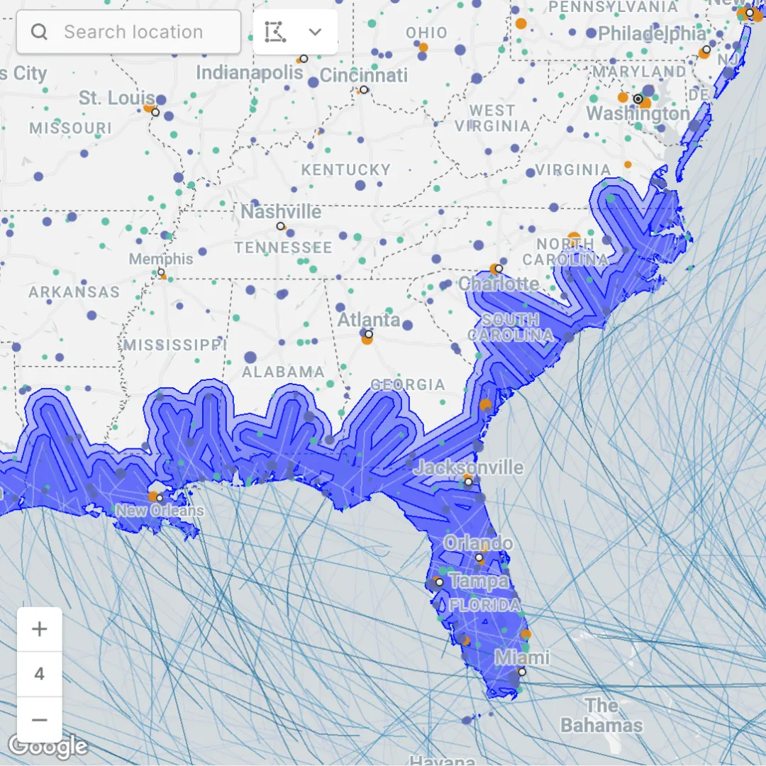 Make this map: We shared a tutorial on how to turn raw hurricane point locations into tracks (like in the map below) in this edition of our monthly LinkedIn newsletter, “Spatial Perspectives.” You can then use the Distance to nearest component in Workflows to calculate the distance from each airport to the nearest hurricane, and then employ a series of widgets to allow users to filter to the most relevant data points.