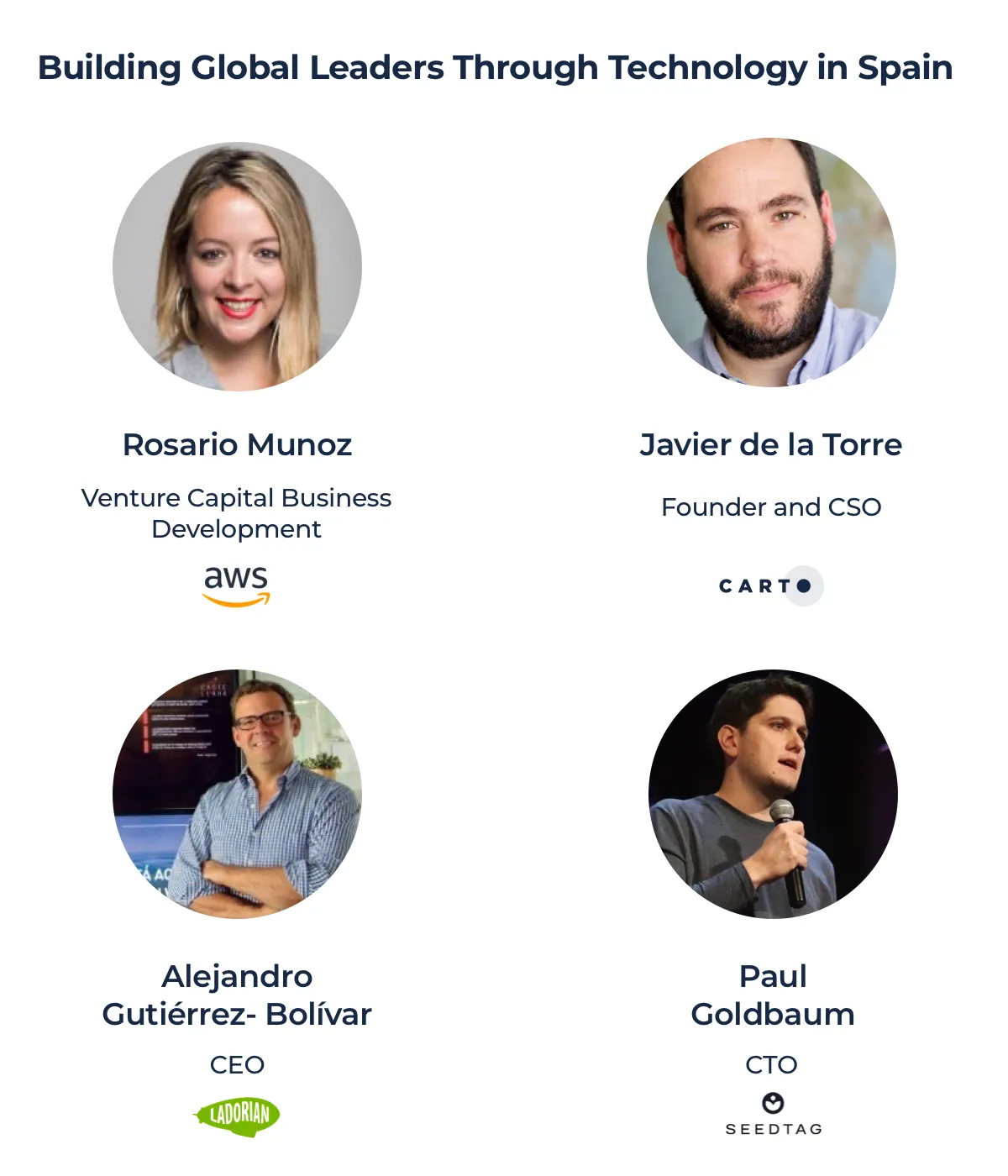 May 5 12:15 - 13:20: Speaker Rosario Munoz (Venture Capital Business Development at AWS Iberia) will be joined by Javier de la Torre (Founder and CSO at CARTO) Alejandro Gutiérrez- Bolívar (CEO at Ladorian) and Paul Goldbaum (CTO at Seedtag) will be discussing how they have attracted and retained qualified talent while inspiring future entrepreneurs and educating society about the importance of the economy of technology and innovation.