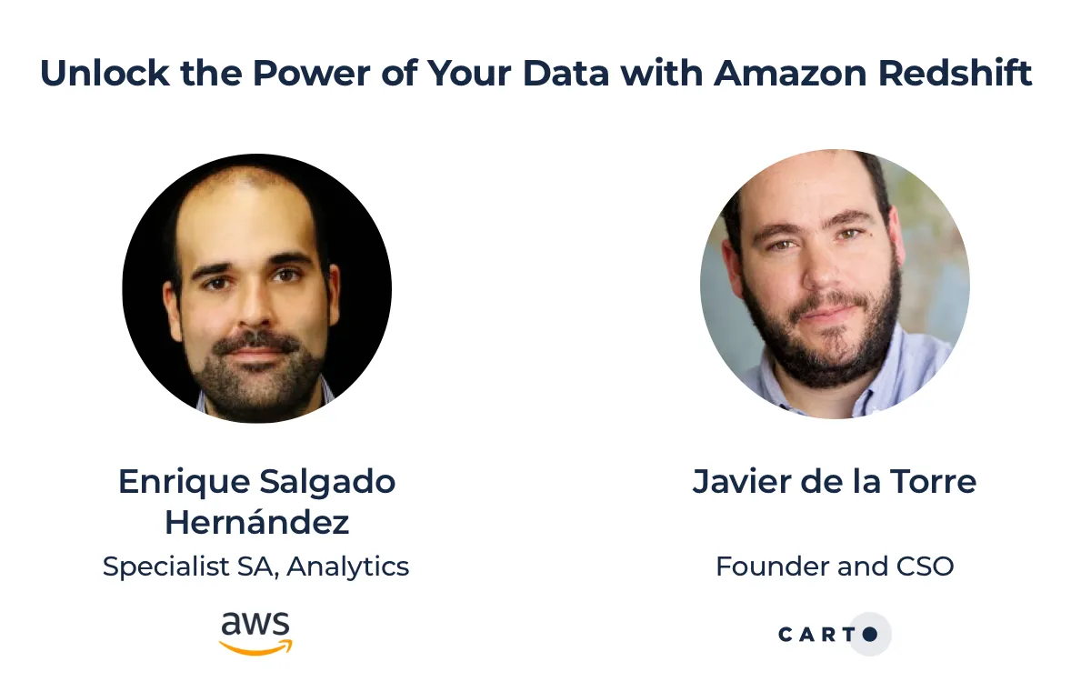 May 5 15:10 - 15:55: Enrique Salgado Hernández (Specialist SA Analytics at AWS) and Javier de la Torre (Founder and CSO at CARTO) will discuss how to use Amazon Redshift to make data-driven decisions quicker gain better insights and overall put data at the service of innovation for your business.