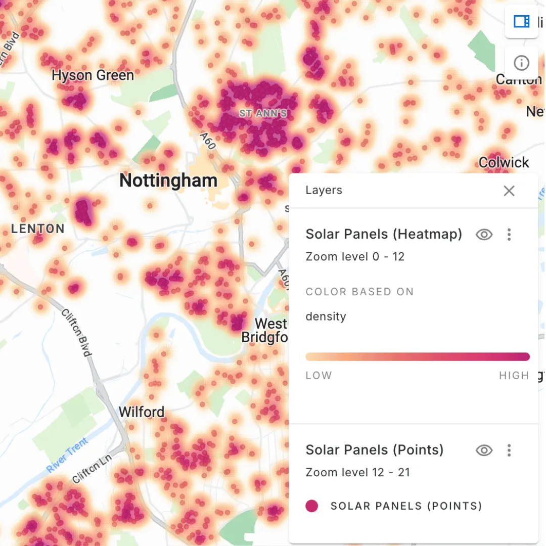 Analyzing solar panel distribution in the UK. Want to recreate this map? You can find the source data for this in the CARTO Data Warehouse under demo tables.