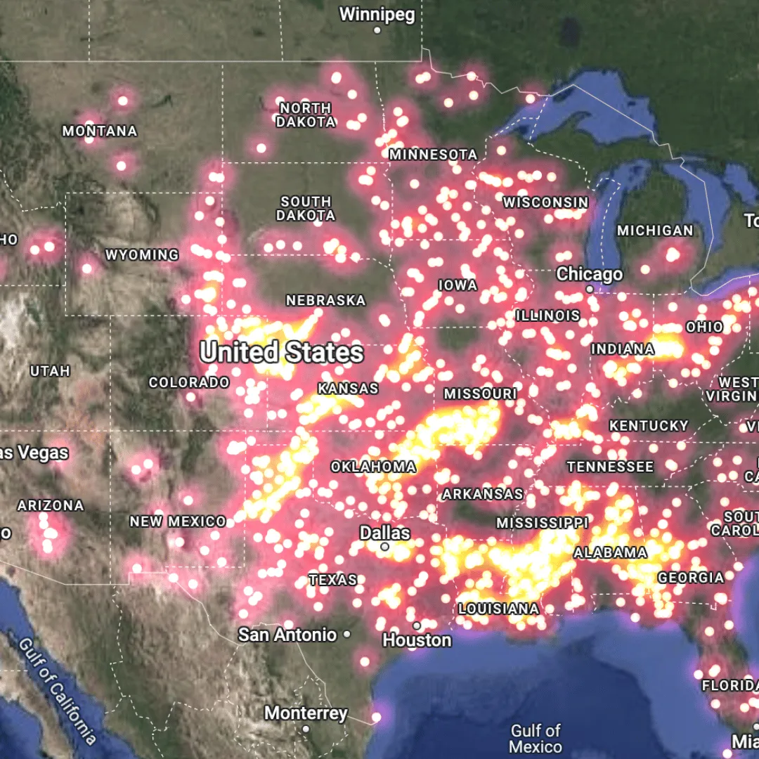 Heatmaps are a powerful way of visualizing your spatial data which uses color gradients to represent the density and intensity of data points over a geographical area. They can be based purely on the spatial distribution of data - such as the number of tornadoes (see below) - or can be weighted to account for numeric variables such as mobile signal strength or earthquake magnitude.