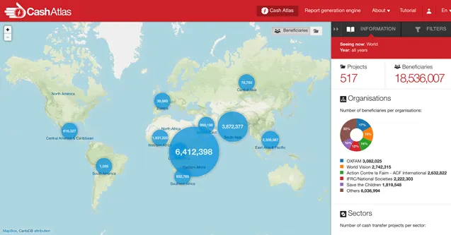 The data used to create this map was shared by the organizations involved in the programmes. The main aim of the project is to improve the quality of emergency cash transfer and voucher programming across the humanitarian sector. You can browse data by regions, countries, organisations, sectors, donors… The information comes from more than 500 projects and have impact in almost 20M beneficiaries.
