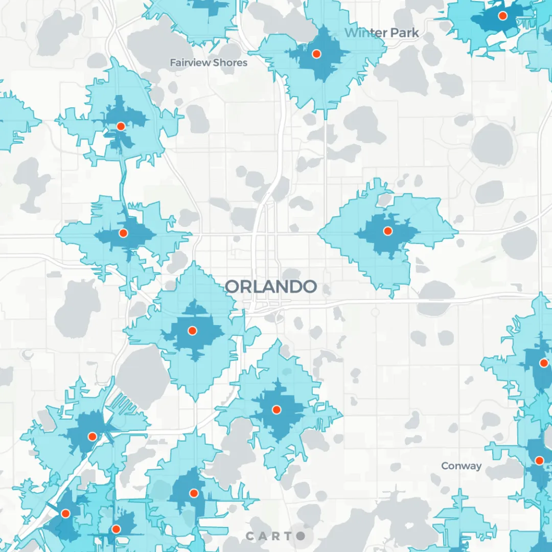 This will create a new table of isoline geometries based on your parameters - such as the example below which shows 15 and 30 minute walk-time catchments from McDonald’s locations in Orlando, Florida.