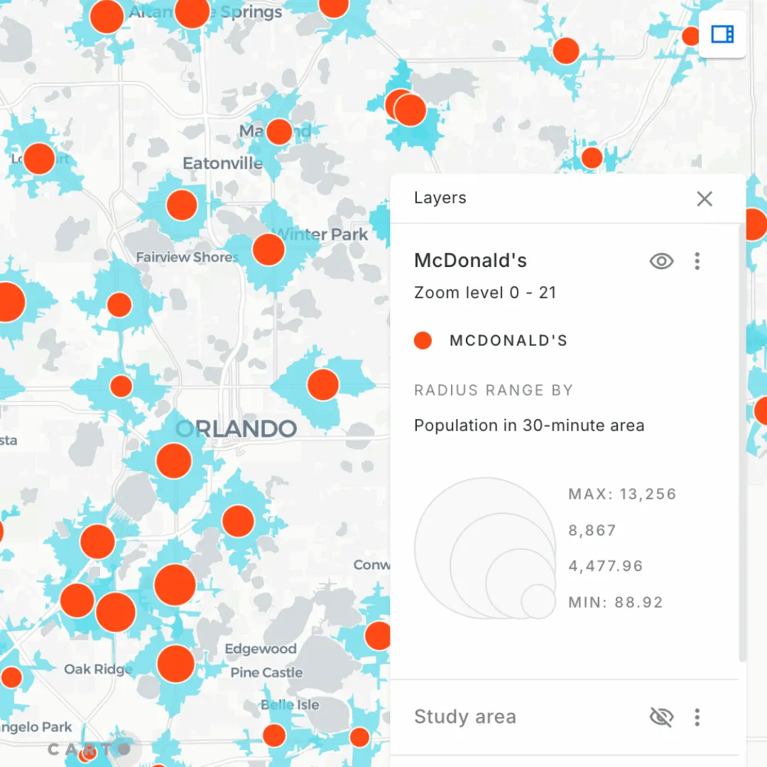 Extending our McDonald’s in Orlando example below, we’ve enriched our 30-minute walking isolines from the previous example with the total population (freely available via the American Community Survey here) as well as a “fast casual affinity" index. This index is available through our data partner Spatial.ai’s Geosocial Segments dataset. It scores people against 72 indexes based on their experiences personalities, feelings shared over social media platforms. Learn more about power of geosegmentation here.