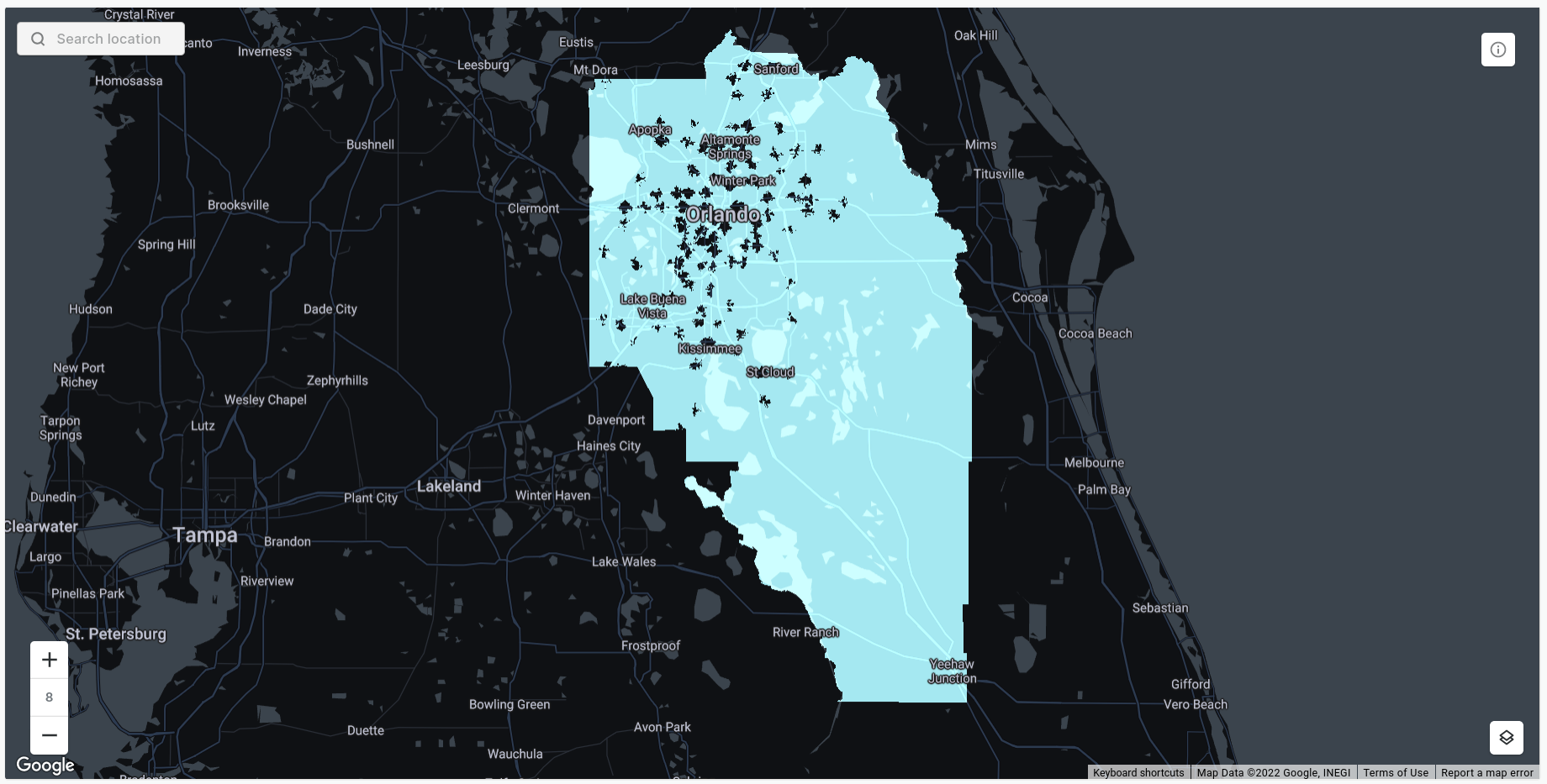 For instance, in the map below the light blue area highlights all of the places in our study area (consisting of the Orange, Osceola and Seminole counties, Florida) which are beyond a 30-minute walk from a McDonald’s. This area can be created using the St Difference component in CARTO Workflows, using isolines and an area of interest as inputs. Using our enrichment tools again, we can calculate that 1,783,500 residents live in this area - approximately 84% of the population!