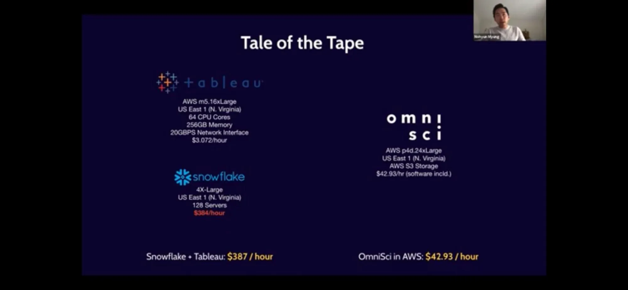 When you are using a GPU accelerated geospatial service, the GPUs need to be running around the clock, no matter if you are using it or not. As you scale and add more data or dashboards, you may need to add more GPUs to keep performance up, and these services are expensive. Take this example from a a webinar from HEAVY.AI that compares the compute resources for their GPU accelerated analytics platform compared to Snowflake with Tableau: