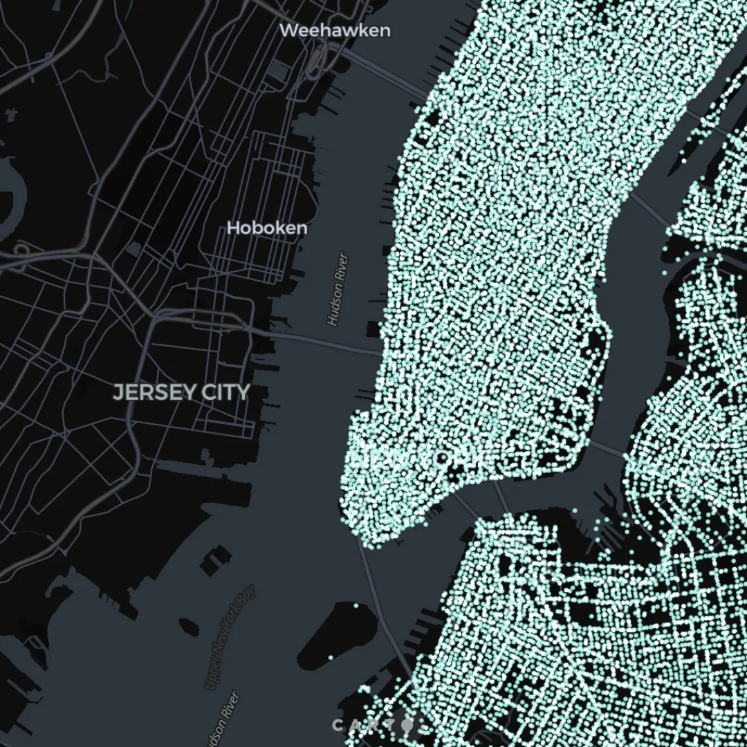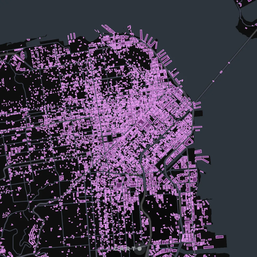 For datasets including polygons and lines, our Dynamic Tiling implementation follows a slightly more complex approach. Larger features are prioritized over smaller ones, as they are more visible at any zoom level. Therefore in order to ensure an optimal performance, we rank features based on size, and then we apply a level of simplification that is dependent on the zoom level; this process removes invisible details and reduces the size of the data significantly. We finally apply a limit that controls the number of features per tile that are transferred to the front-end for rendering. The following map is rendering a table with 49.5M polygons (OpenStreetMap building footprints) natively from a cloud data warehouse.