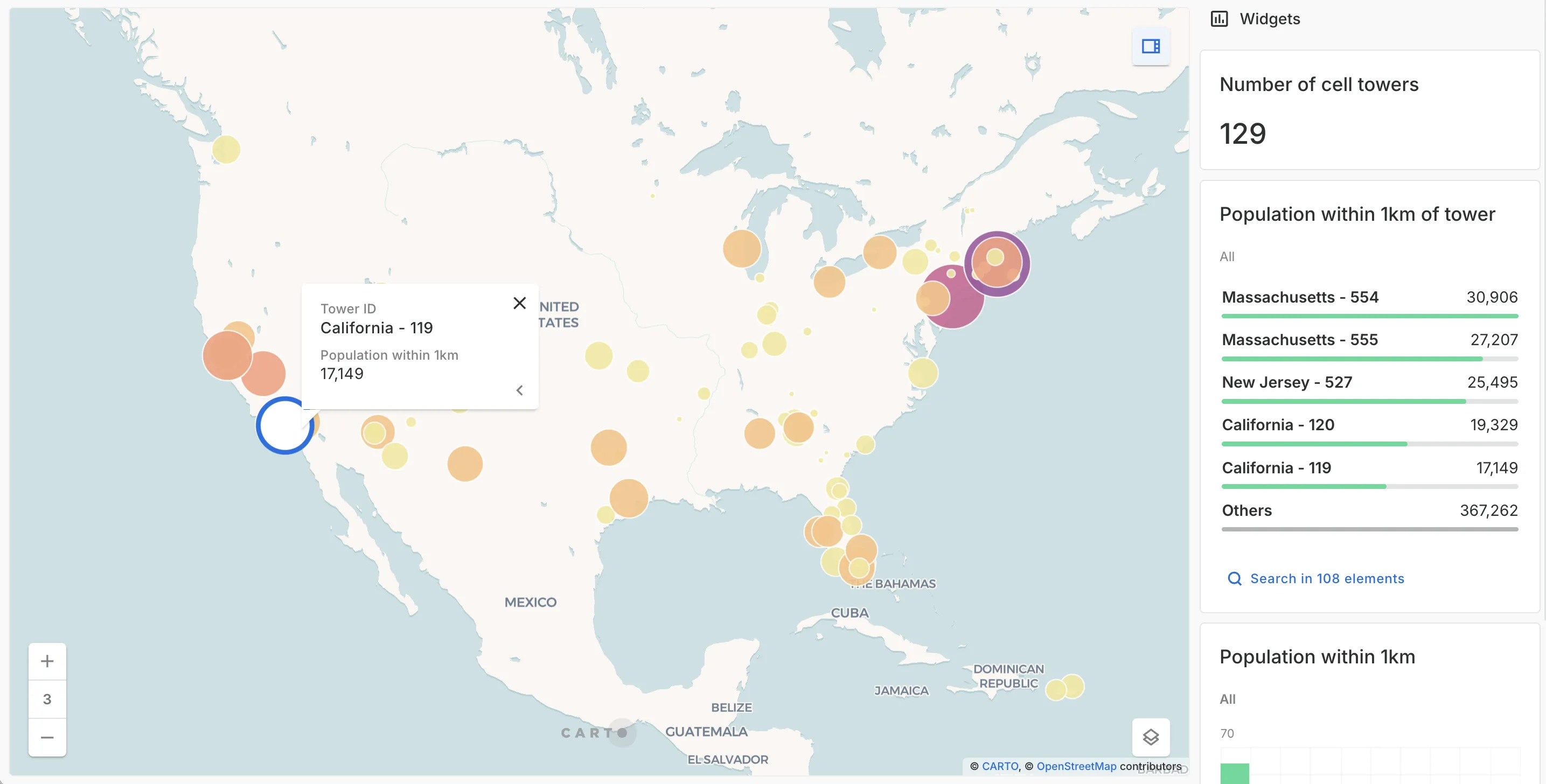 - A target: your origin locations. We’ll be using a subset of cell_towers_worldwide which is a demo table in the CARTO Data Warehouse, but you can use anything: your own source data, a POI table from the Spatial Data Catalog, you can even use components like Draw Custom Features to plot your own locations!