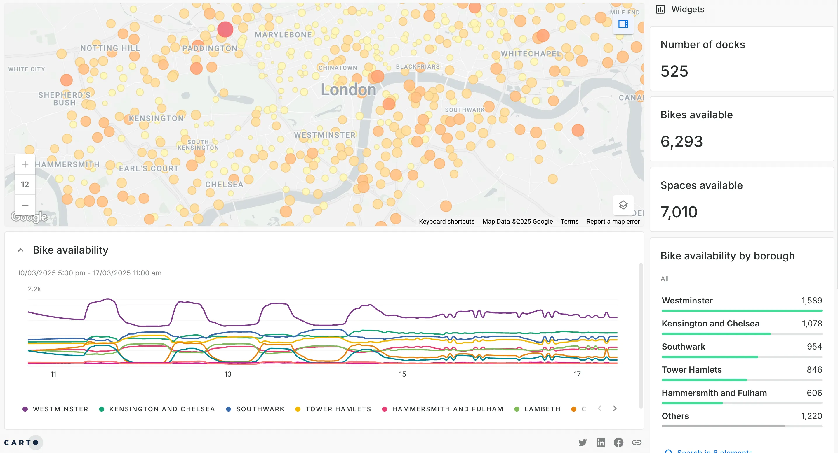 - Bikes available - most recent: just the most recent “cut” of this data, ideal for making decisions based on real-time developments. This data is driving the widgets on the right-hand side of the map.