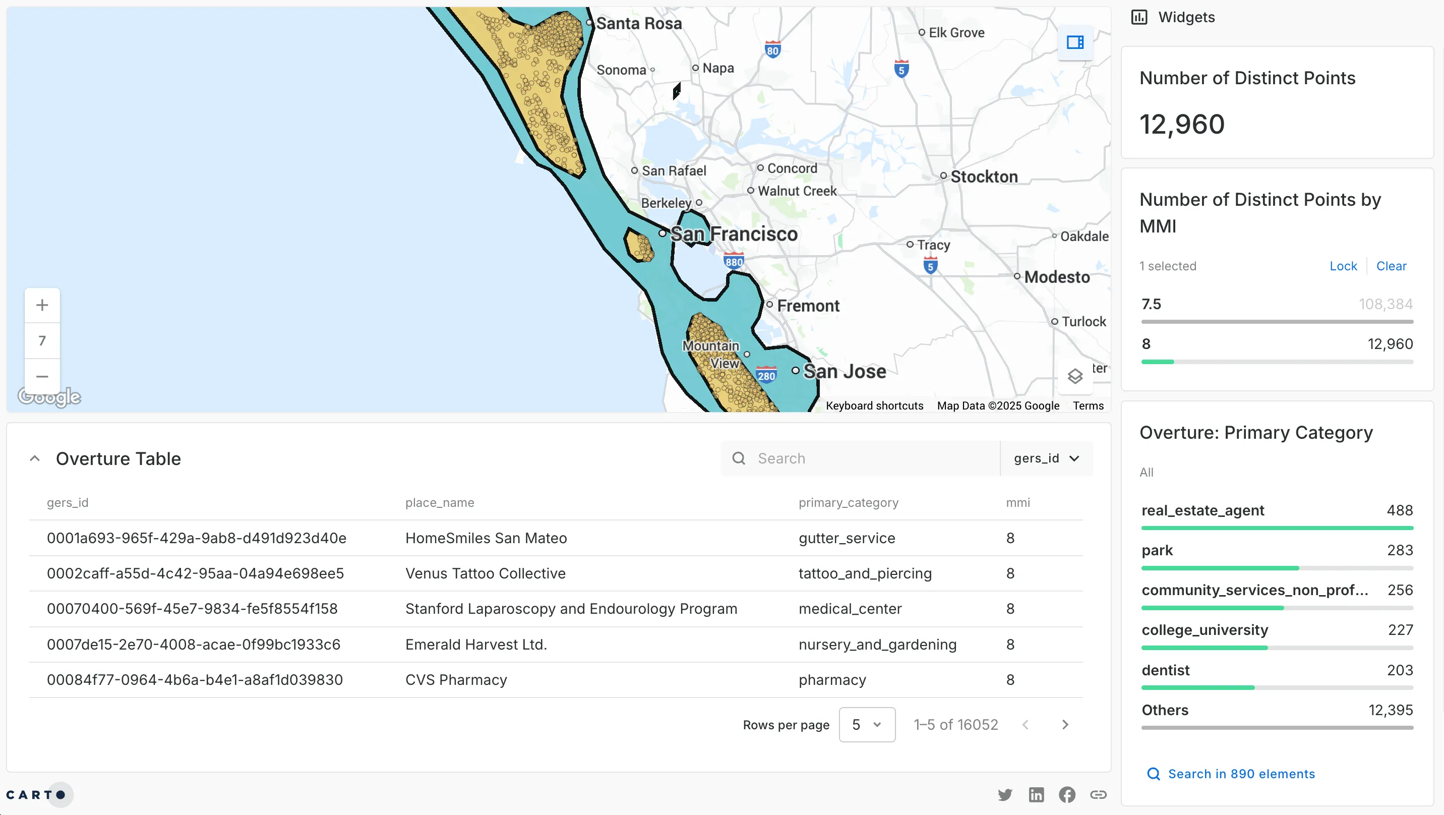 You can start with two free and open datasets: the free Overture Maps Foundation POI layer and an earthquake hazard polygon layer. With CARTO you can easily connect these to identify a narrow set of the highest-risk businesses, such as coffee shops, grocery stores, dental offices.