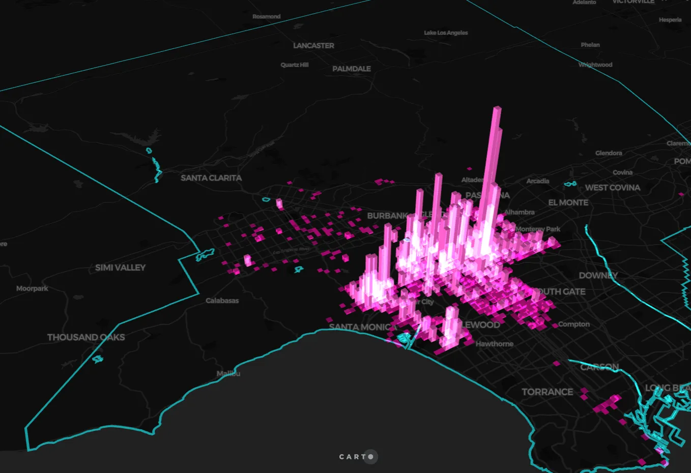 The map below shows the results of this, with yellow areas being where residents are most closely aligned with the characteristics of the “Asian food & culture” group. In CARTO Builder we’re able to simultaneously visualize the size and color of variables in H3-based datasets. We’ve sized the hexagons by their 5-mile radius population to begin to visualize where might be the best locations for an Asian food ghost kitchen.