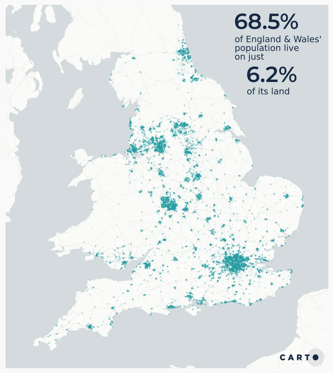The map on the left shows the data in original irregular zones known as Lower Super Output Areas (LSOAs). These are one of England’s smaller administrative geographies, generally formed of around 1 500 people or 650 households. This means they vary massively in size: 69.4% of England & Wales’ LSOAs (equating to 68.5% of its population) cover only 6.2% of its total area. In this map it’s harder to see the data in smaller areas with high population densities whilst larger sparsely populated areas - such as parkland and industrial areas - dominate the map.