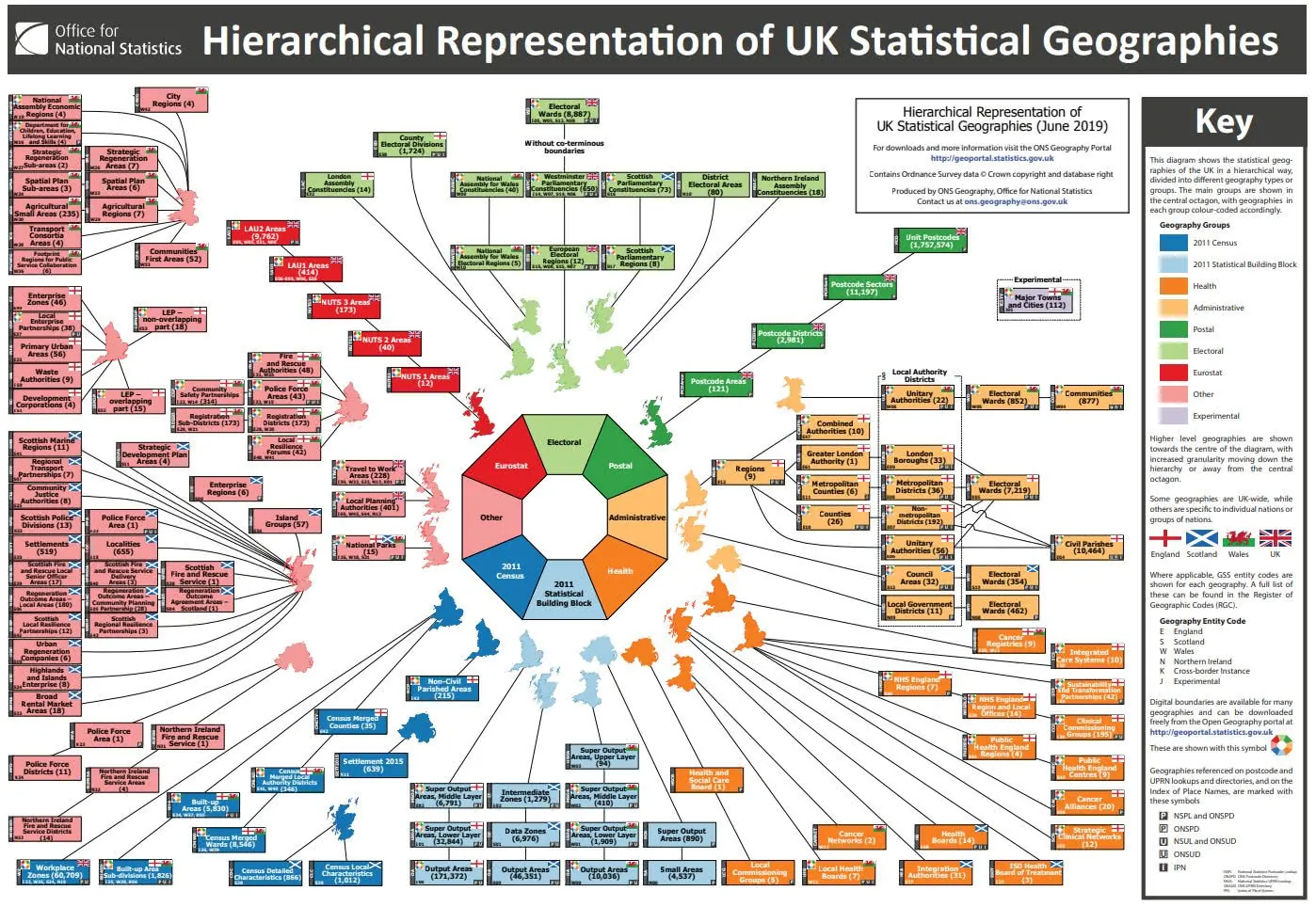 Most data in its raw form is collected at aggregated to and shared as irregular administrative zones. One of the immediate problems with irregular zones is, well… they aren’t all the same! The graphic below from the UK’s government statistics body the Office for National Statistics perfectly illustrates how complex administrative geographies can be. Regular zones are far easier for data scientists to work with as they are a great way of neatly collecting data from multiple zones into just one geography.