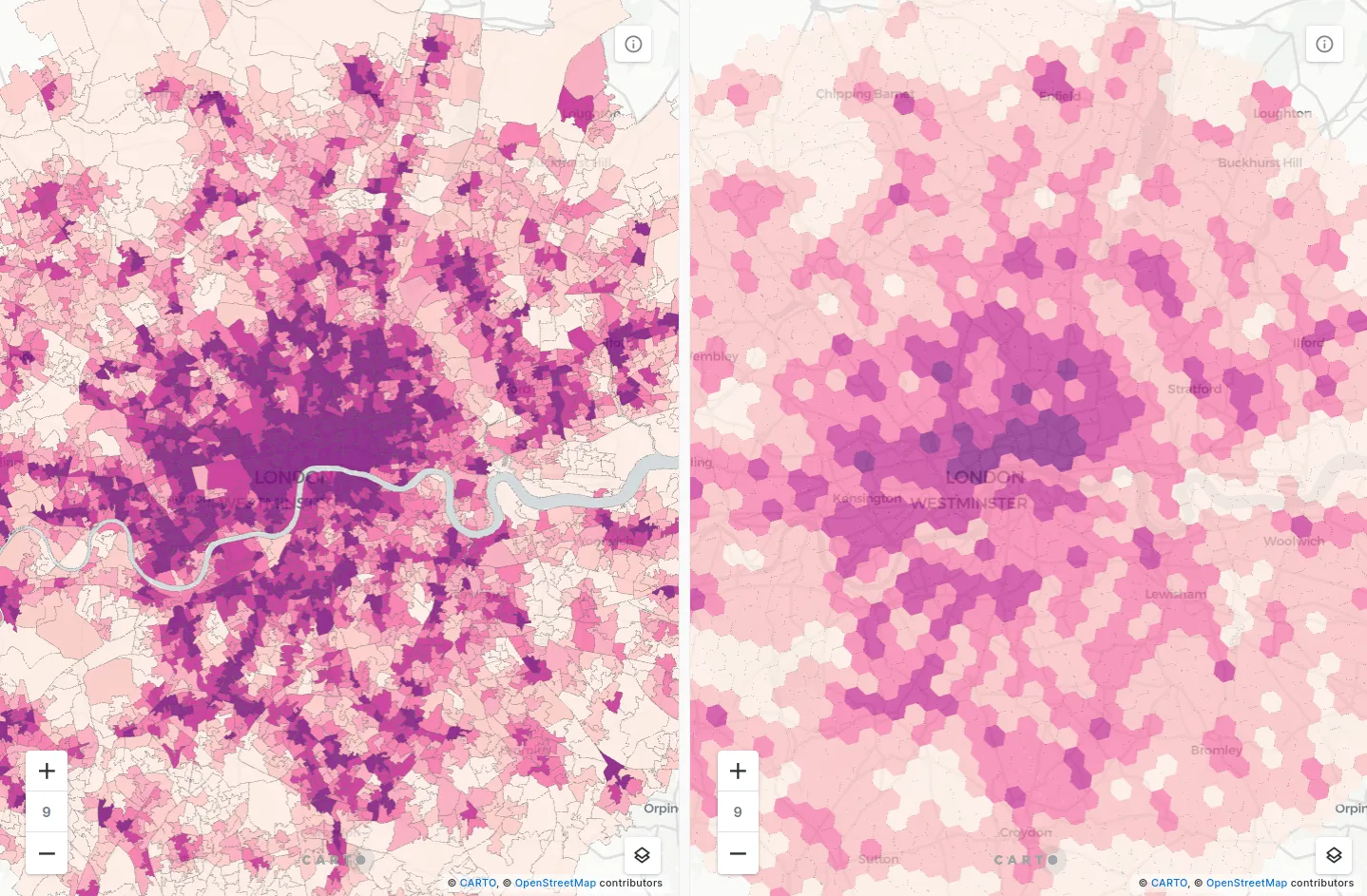 Let’s illustrate with an example. The maps below show the retail landscape of Inner London. Darker pink areas are where residents have better access to retail services as defined in the Access to Healthy Assets and Hazards dataset available to all CARTO users via our Spatial Data Catalog. This dataset also contains information on access to health services green and blue space as well as air quality ratings. This makes it an excellent source for understanding quality of life. Explore the interactive version here.