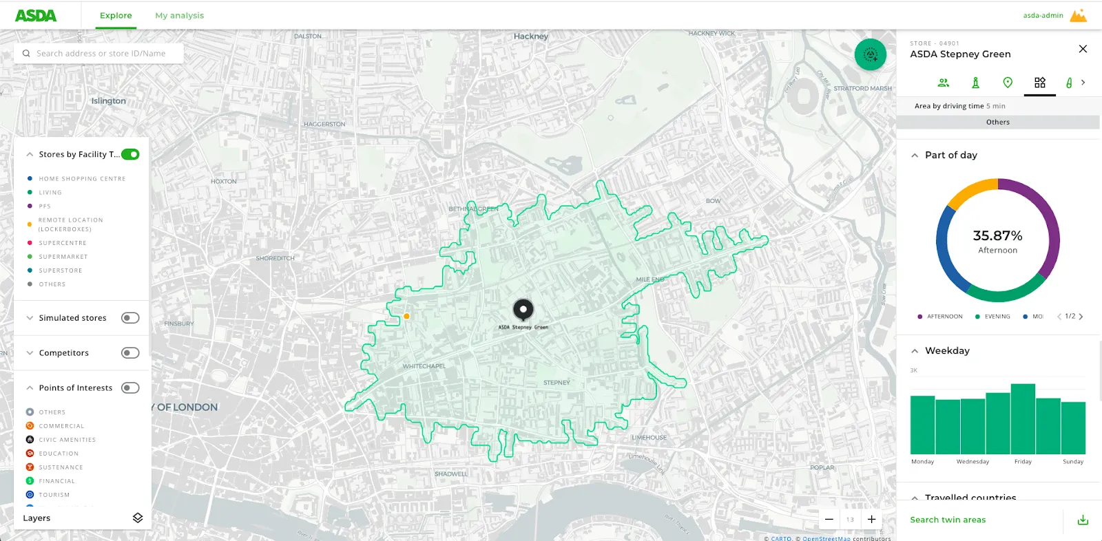 Within the platform they were able to look at the core data of how many people lived within a location how far folks lived from potential site locations the time of day people were typically near the area of the potential site and see how close the sites were to pre-existing ASDA estates. They also factored in points of interest as well as the location data for local competitors to further enhance their predictions as to which potential sites could drive the most volume.