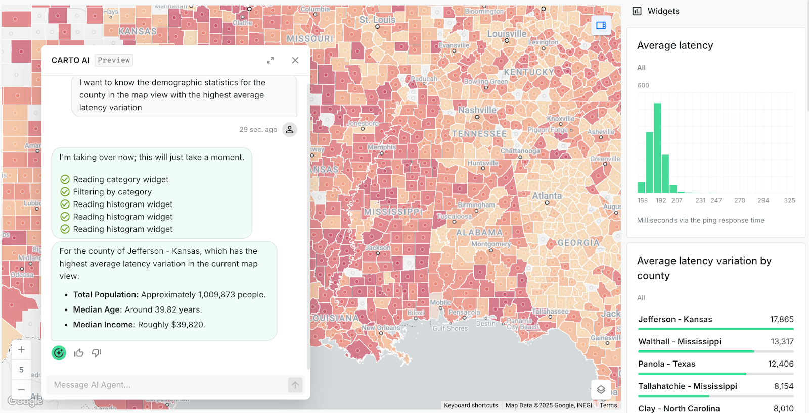 Once subscribed, you’re ready to start using KASPR data to deliver real outcomes - straight from your lakehouse! For example in the map below, the map user is leveraging CARTO AI Agents to the demographic data which relates to the KASPR latency statistics, ideal for prioritising network improvements!
