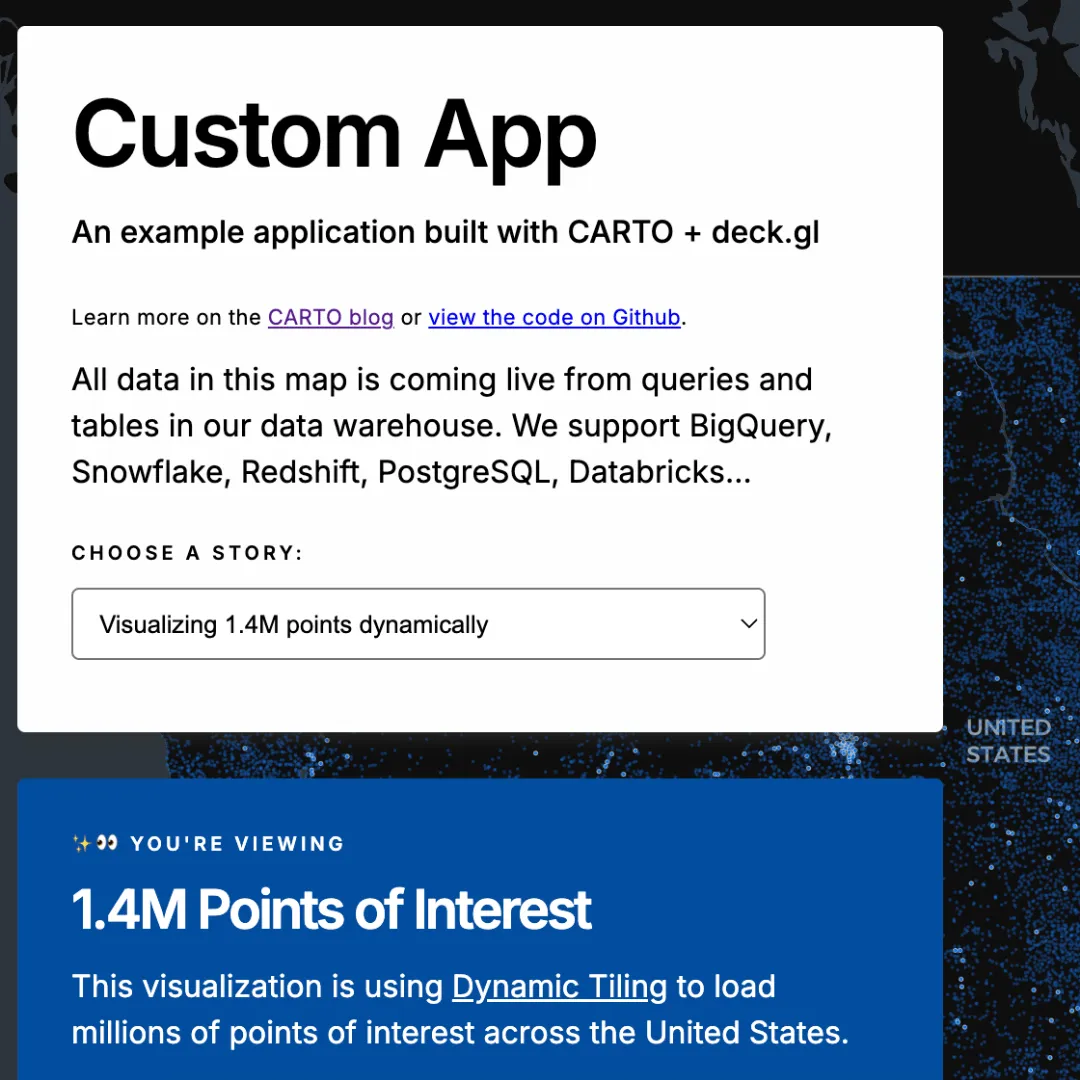 - This custom application uses CARTO + Deck.gl in a simple Typescript structure, with no other dependencies. All the data you’re viewing is retrieved through a cloud native data warehouse connection, without any ETL or replication.