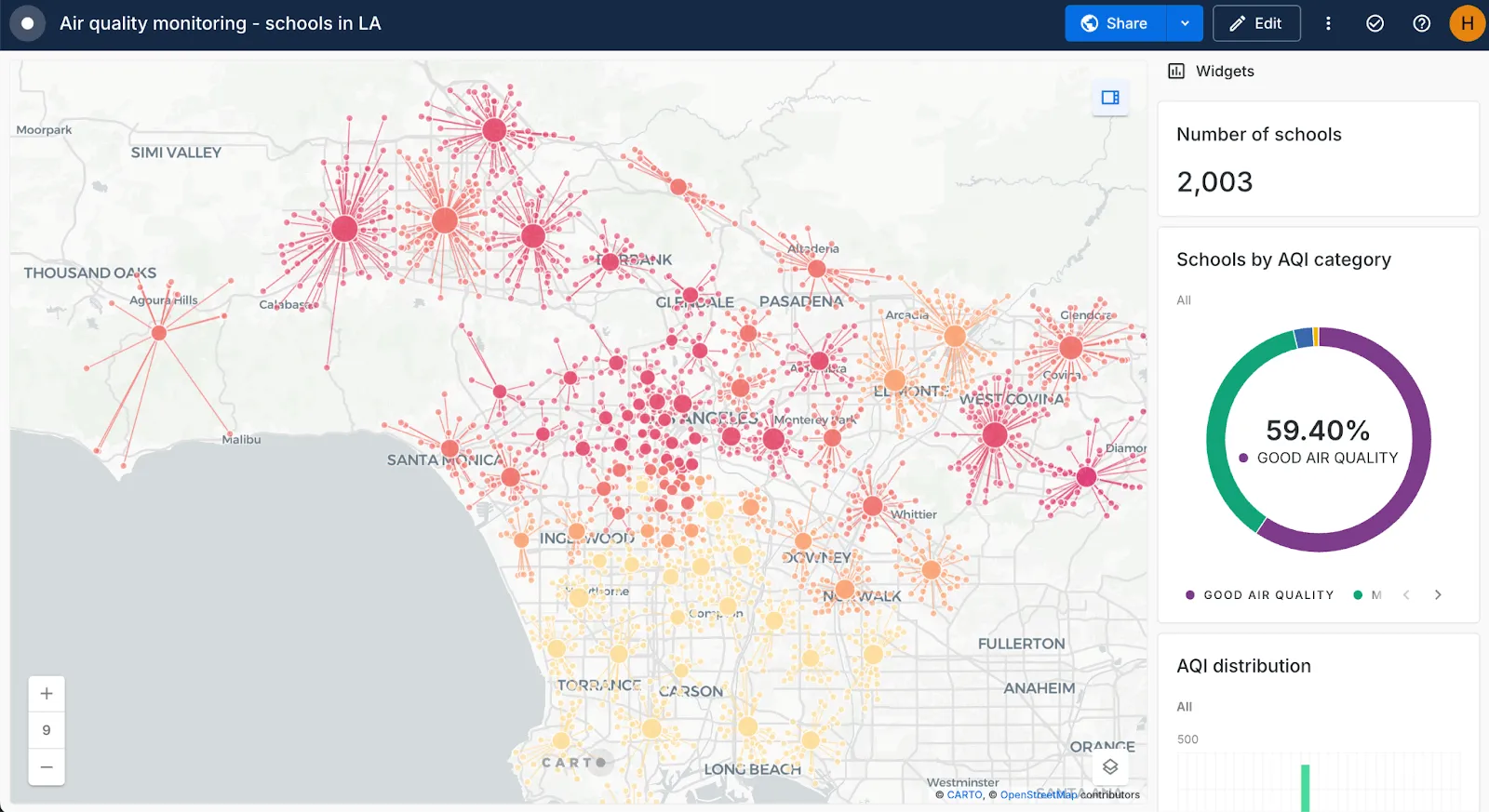 This workflow is monitoring real-time air quality for schools across Los Angeles using the Google Environment APIs CARTO Workflows Extension Package. To ensure this analysis does not exceed the Air Quality API Current Conditions quota of 1,000 calls per project, a Conditional Split is applied: