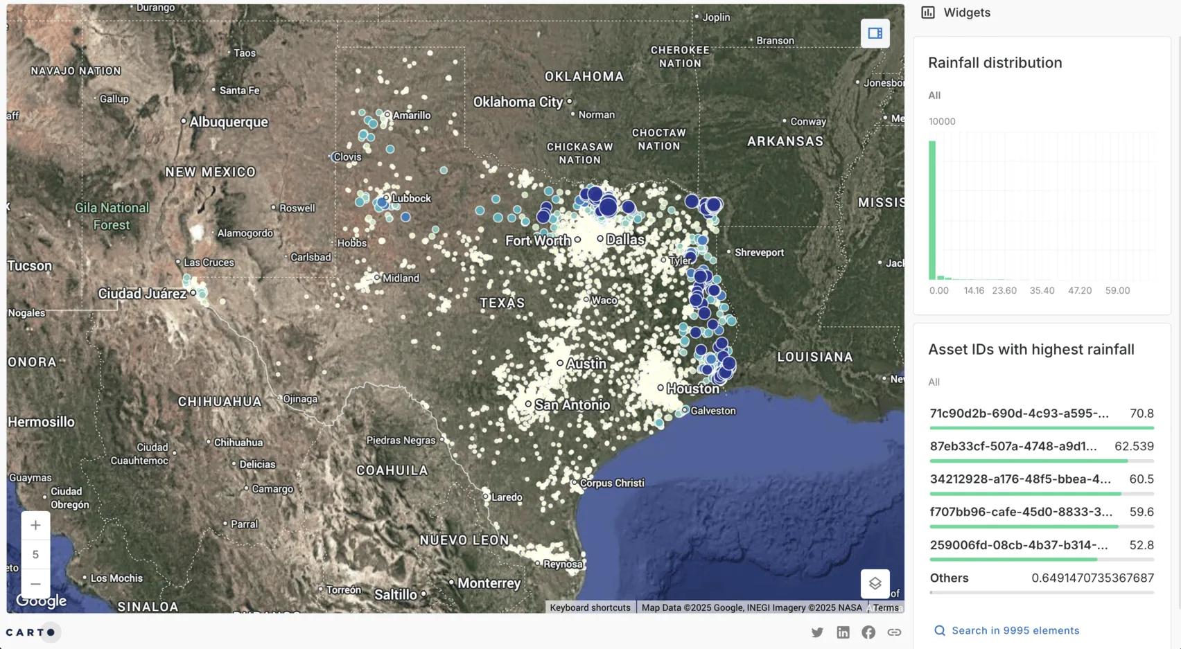 This workflow is monitoring rainfall levels for a series of 10,000 properties across Texas via the Google Earth Engine CARTO Workflows Extension Package. The initial Summary Table component attempts to find the average rainfall for the current date. If this process fails, a Success/Error Split component (highlighted in green) routes the analysis through a different Summary Table component which calculates the average rainfall for the previous month. In both branches, the results are added to the CARTO Builder map below (open in full-screen here).