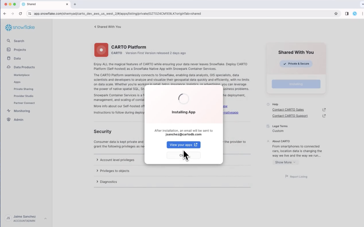 Check out how you can easily get started with deploying CARTO inside Snowflake in just a few clicks below