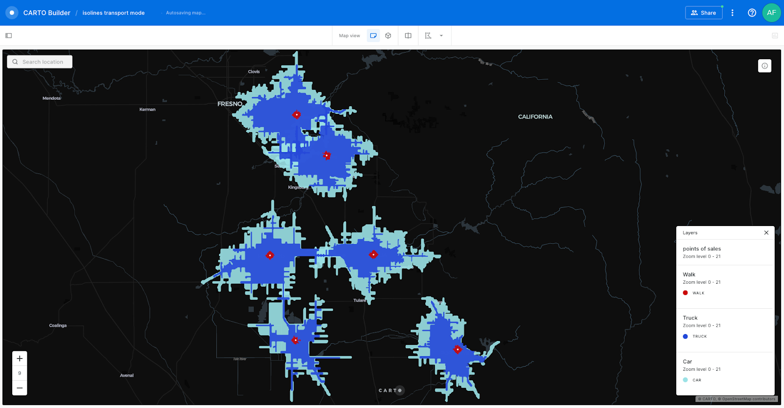 In the December release of the Analytics Toolbox for BigQuery, Snowflake and Redshift we added the possibility to configure more options as parameters when executing functions to CREATE_ISOLINES. These new options, which depend on the LDS service provider, allow the user to configure more transportation modes such as truck or bicycle, the possibility of specifying departure or arrival times allowing the creation of reverse isolines, and other options including different routing modes.