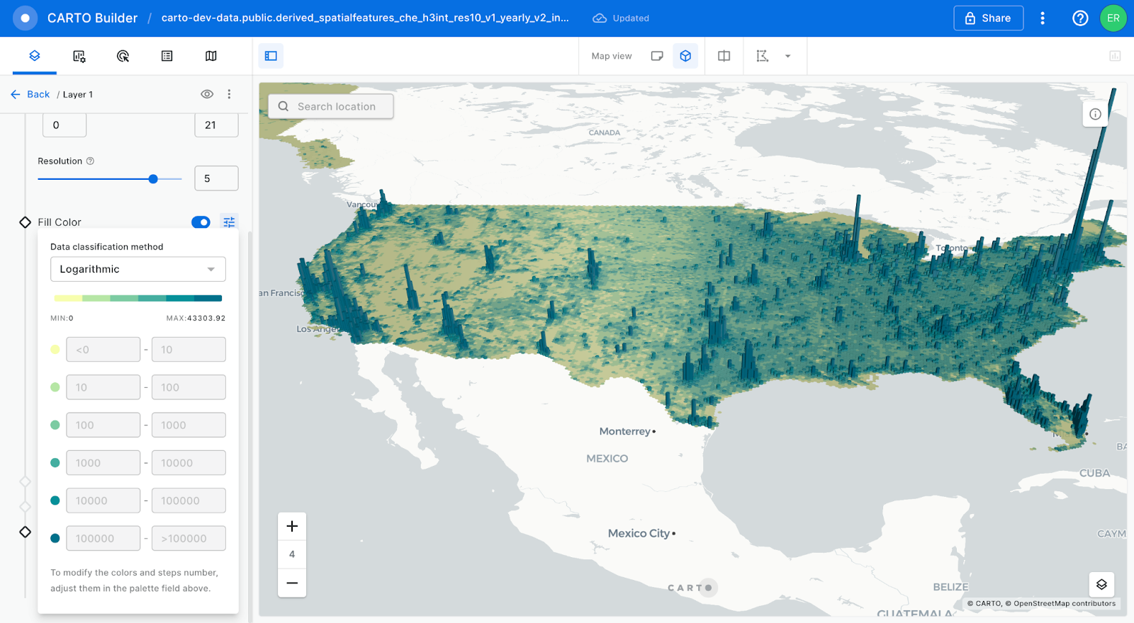 Logarithmic scales are now available as a data classification option in Builder. While they’re available for all types of data sources, a logarithmic scale based on powers of 10 will be the default option for aggregated data sources.