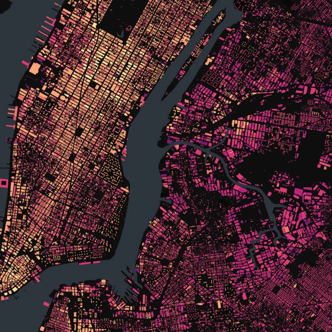 Below we can see vector data being used to convey building heights across New York City (open in full screen here) - notice how every building is a distinct feature.