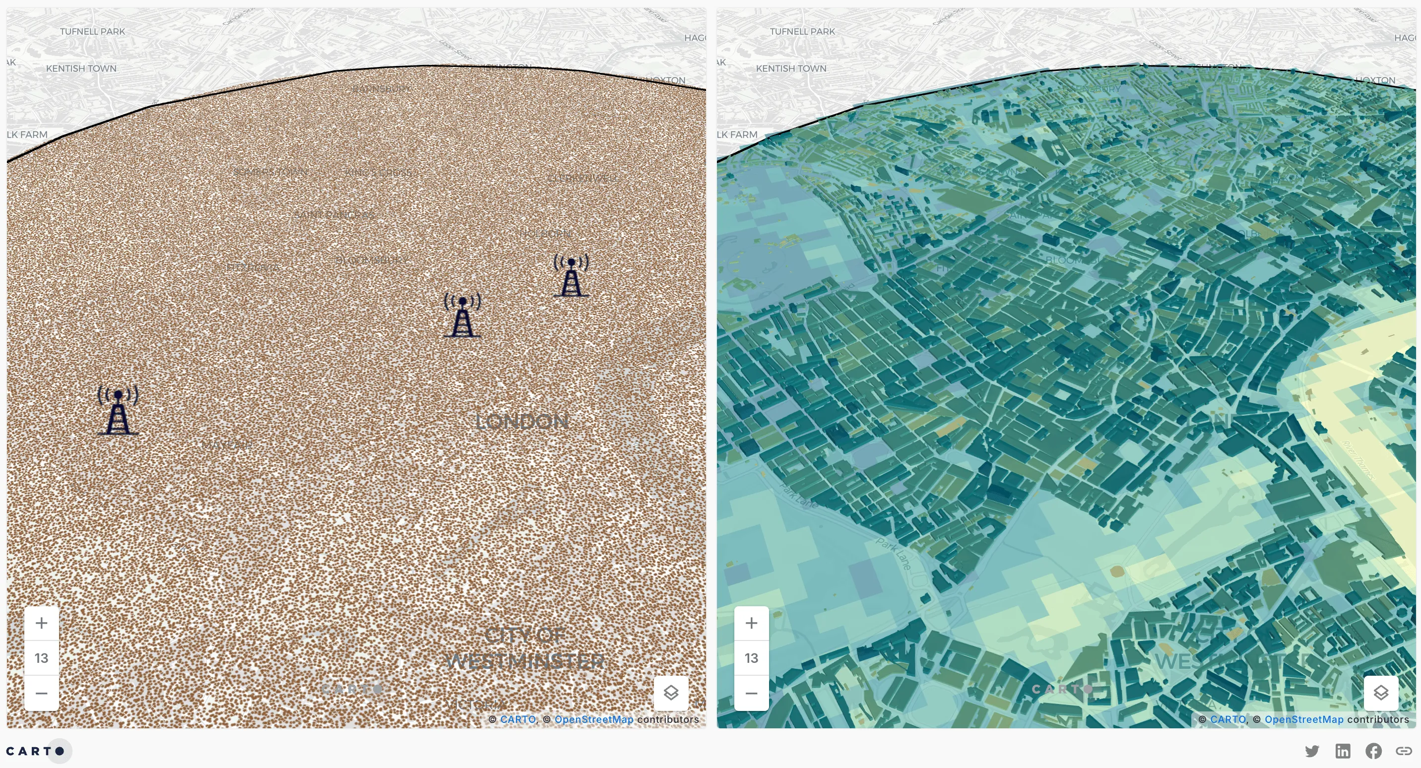 Let’s take a closer look at how this extension can help telecom data analysts to optimize the placement of a new 5G cell tower in a dense urban area like London through the workflow below. Note that the full workflow can be found as a workflow template in the CARTO Academy - allowing you to just download, drag and drop directly onto your Workflow canvas.