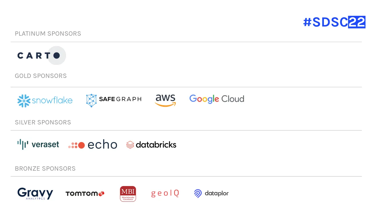 The SDSC keynote was delivered by CARTO CSO and Founder Javier de la Torre. Entitled “The geo data cloud for everybody: Everything for everyone ” in his talk Javier shared his vision on how the Geo Data Cloud Spatial Indexes and No-code analytics are enabling geospatial at scale and for everyone.