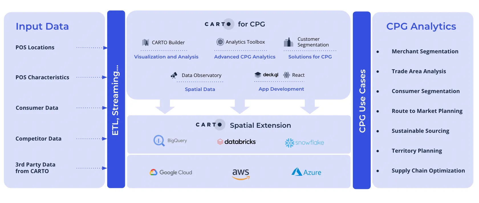 CARTO for CPG is an integrated offering that runs natively on the leading cloud data platforms. It brings together first-party data on consumers and trade partners powerful external spatial data to enrich understanding and a set of out-of-the box analyzes to drive key CPG route-to-market strategies.