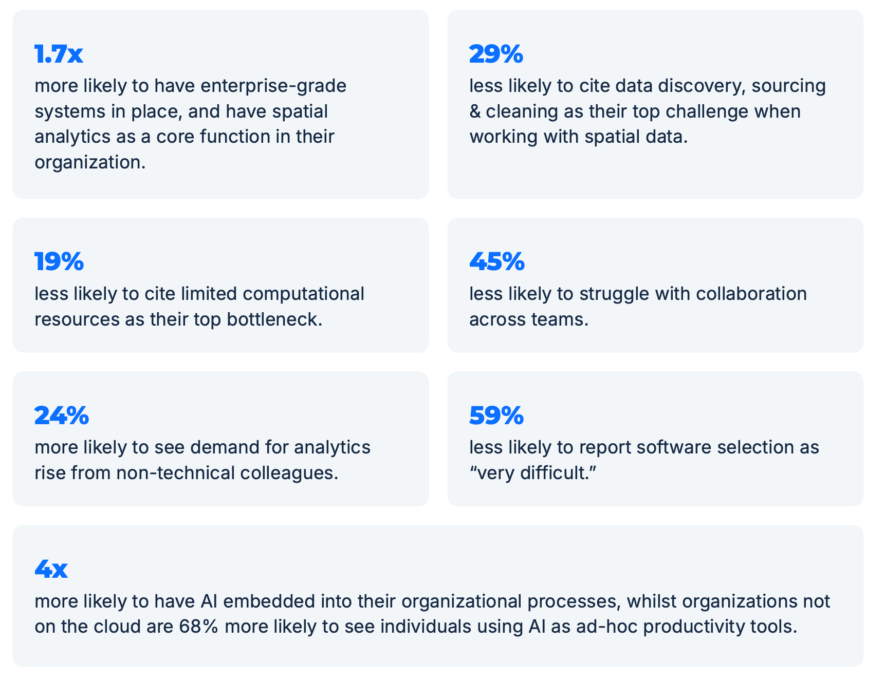 Organizations that operate this way consistently see better outcomes. Survey results show organizations running spatial analysis on the cloud are: