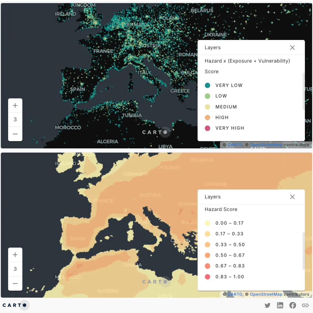 This blogpost has shown a simplified approach to creating a composite score to measure the risk associated with climate-related hazards for different types of assets. Of course, for specific use cases, different types of data might be required. To create your own analysis and select the right data sources, you can take a look at our Data Catalog and can grab a free 14-day CARTO trial to give it a go yourself!