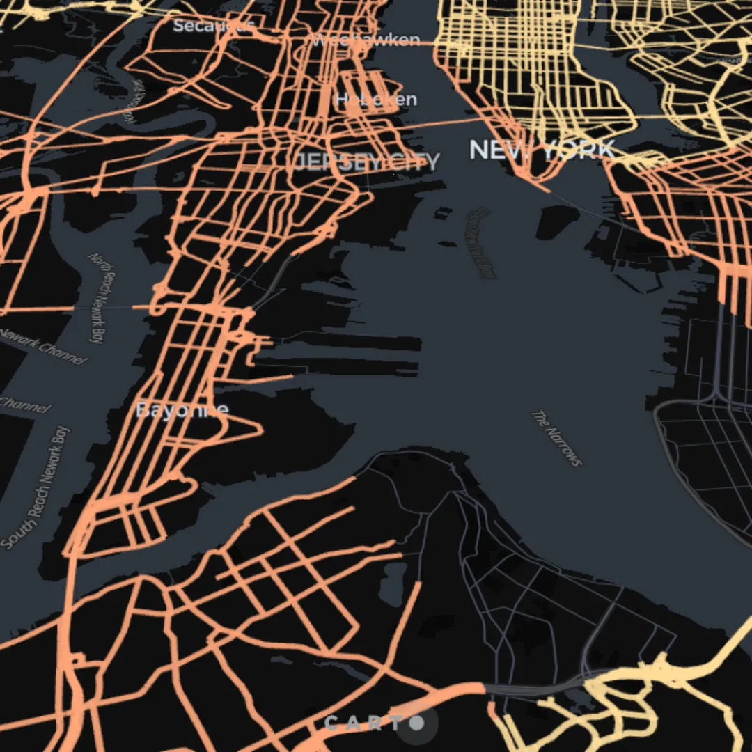 - USA Road network data curated by CARTO, which offers access to OpenStreetMap's highways organized by speed profile for different modes of transportation. These features have been divided into segments that have been built to form the edges of a connected graph.