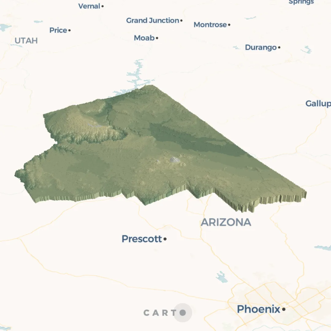 We’ll be using the USA Spatial Features dataset, which you can access via our Spatial Data Catalog here. This dataset includes variables relating to demographics, the economy, climate and environment - in this instance, we’re only interested in elevation in Coconino County, Arizona (see below, or open in full screen here).