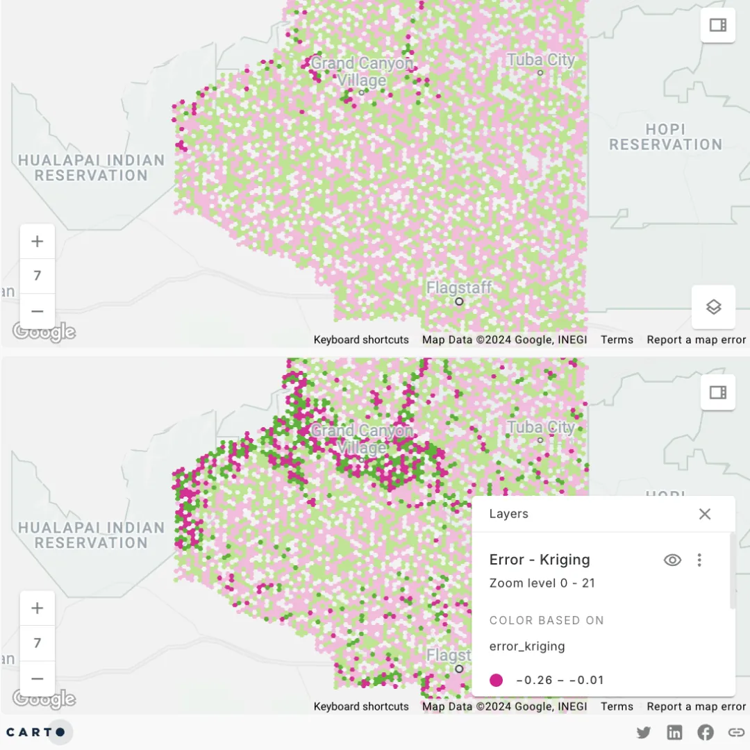 We’re going to remove a random 20% of the 57,915 features in this dataset - then use our two interpolation methods to compare the results! This dataset leverages H3 - a type of spatial data known as a “Spatial Index.” These data are geolocated by a short reference ID rather than a long geometry string, making them small to store and quick to analyze! Learn more about Spatial Indexes in our free ebook!