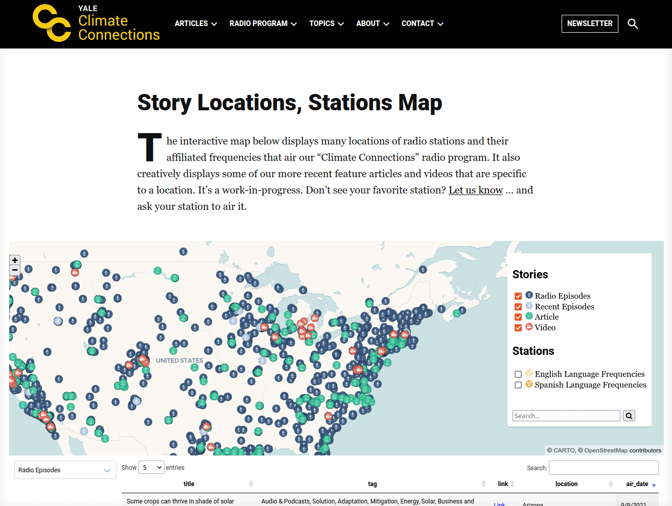 The CARTO-powered Yale Climate Connections map shares the locations of radio stations that air the Climate Connections radio show. It also maps out the locations of topics of pertinent articles and videos.