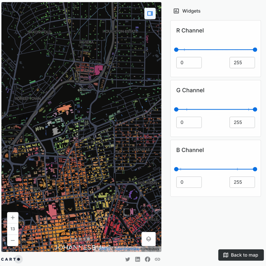To demonstrate this, AlphaEarth’s Satellite Embeddings are visualized below for buildings within a particular region of South Africa. Using the Visualization component, a PCA-based RGB color was generated for fast and flexible visualization.
