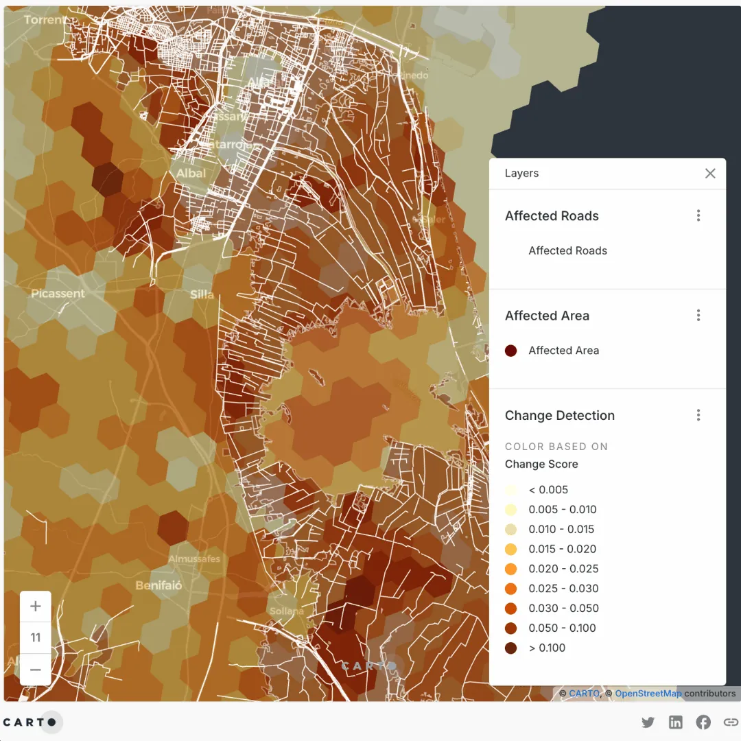 For the 2024 DANA floods in Valencia, Satellite Embeddings from 2023 can be directly contrasted with embeddings generated in 2024 to quantify how much each location changed in high-dimensional feature space. Using the Change Detection component, we can signal areas where flooding altered terrain, damaged infrastructure, or stressed vegetation to identify regions that may require targeted intervention or continued observation.
