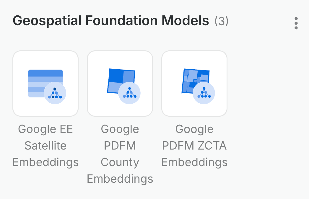 To learn more about the available embeddings, check out these two resources: Google’s Population Dynamics Foundation Models (PDFM) and AlphaEarth’s Satellite Embeddings.