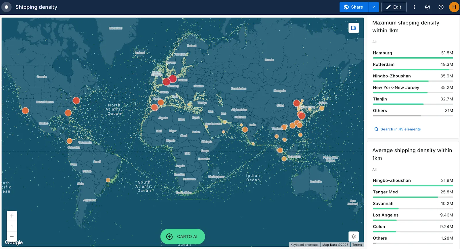 Here’s how we’ve used these powerful capabilities for our example! In addition to creating a stunning map with the massive ship density raster, we’ve overlaid this with the results of our analysis from earlier. Additionally, we've added a series of interactive widgets and pop-ups. This allows users to easily pinpoint the ports - such as Hamburg, Rotterdam and Ningbo-Zhoushan - which have the highest shipping density, helping them to prioritise actions to mitigate supply chain and investment risk.