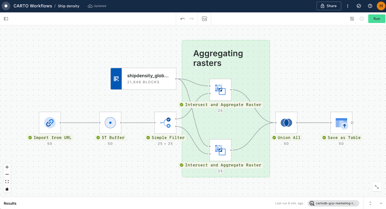 Now, let’s use this data to establish which ports around the world have the highest shipping density. We can do this in a few easy steps with CARTO Workflows, our low-code tool for automating multi-step analysis. We'll be doing that by building the below workflow: