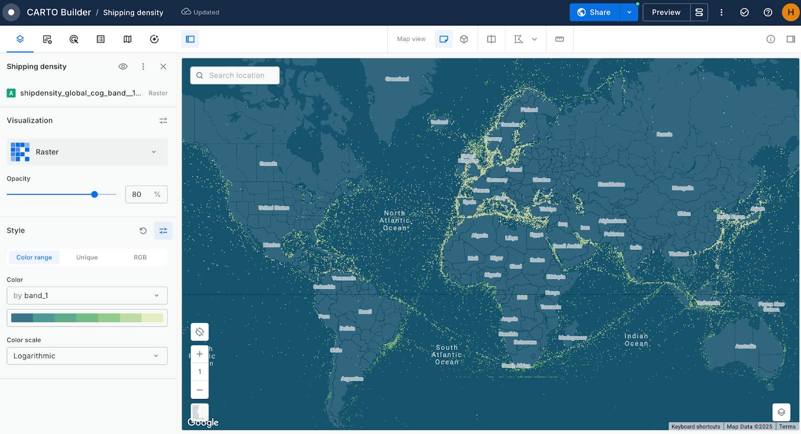 CARTO Builder automatically adapts to your raster's metadata and ensures seamless visualization, even excluding "No Data" pixels for cleaner results. As with vector layers, you also have full control over opacity, zoom level visibility, layer blending and interactions.