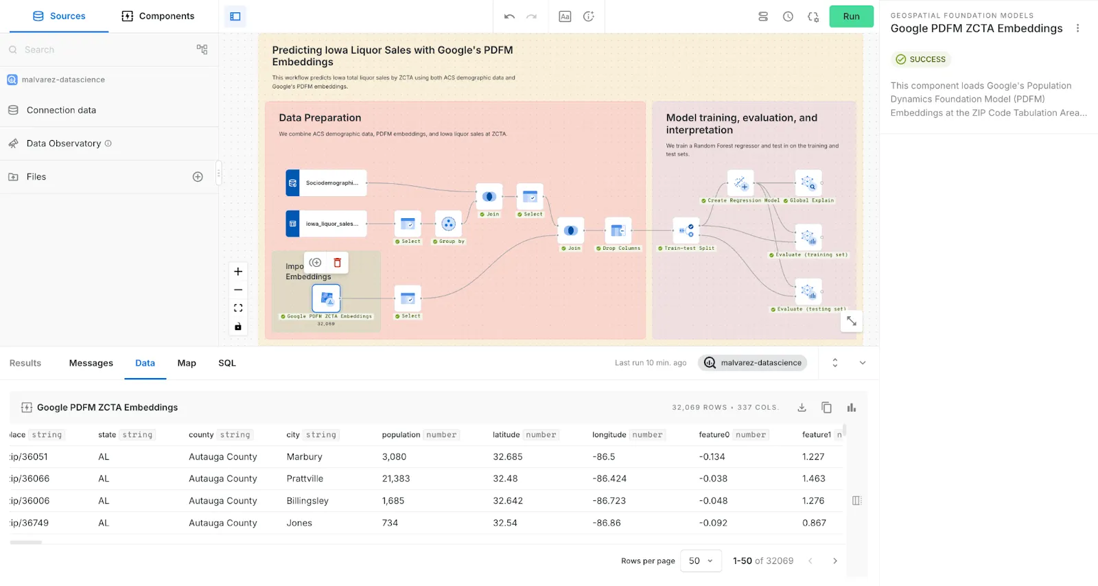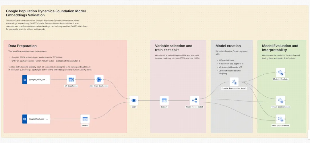 Preview of CARTO Workflows using Google’s PDFM embeddings The demo compared three different models: